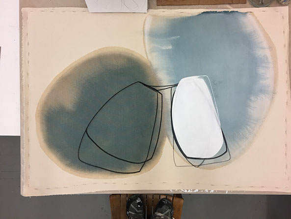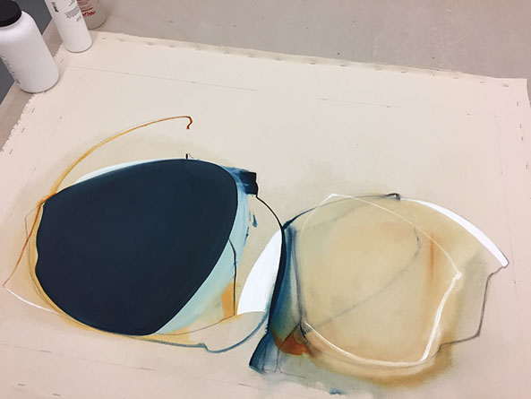 So, at day 5 I started over…I focused on what I love about acrylics and raw canvas: staining. I explored staining and after meditating on the stains, IT just started to happen- using the stains to develop forms and compositions.
